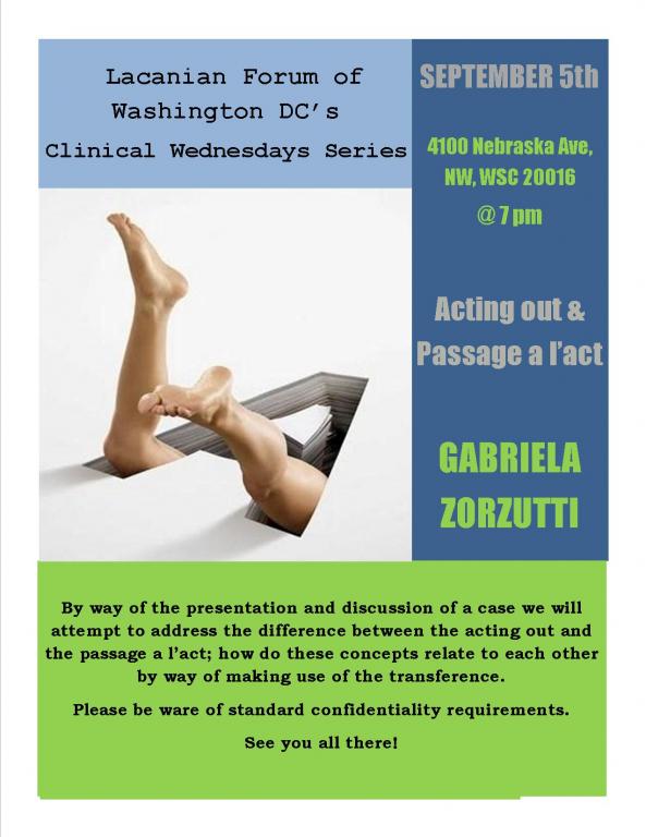 5 September, 2016 Acting out & Passage a l'acte Lacanian Forum of Washington DC's Clinical Wednesday Series Read more
